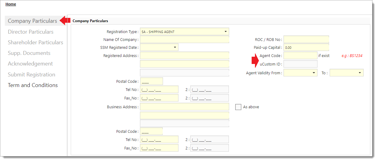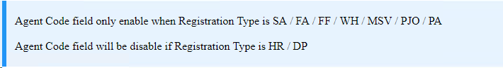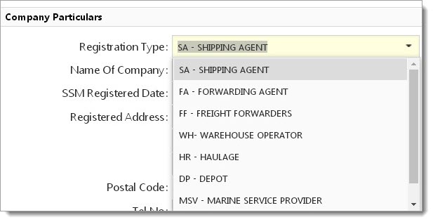 2.Registration Type will always default and display as SA – Shipping Agent. To change to other Registration Type, you have to select from the drop down list and choose the one you require.