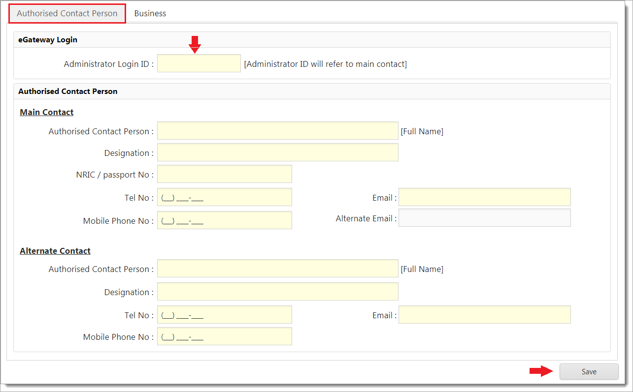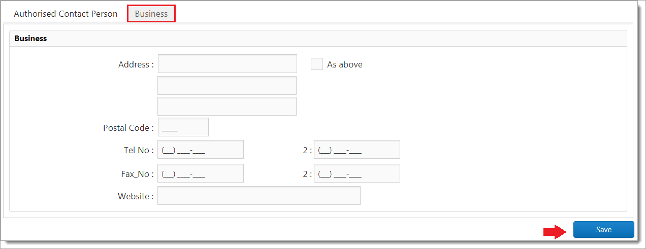 6.Whenever there is Business Contact details to be filled in, information can be entered under Business tab.