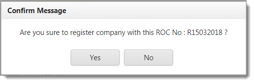 7.Once click on Save button, system will pop up Confirm Message screen for confirmation to save the Company Name with the stated ROC No. You need to click on Yes button to proceed if not click on No button.
