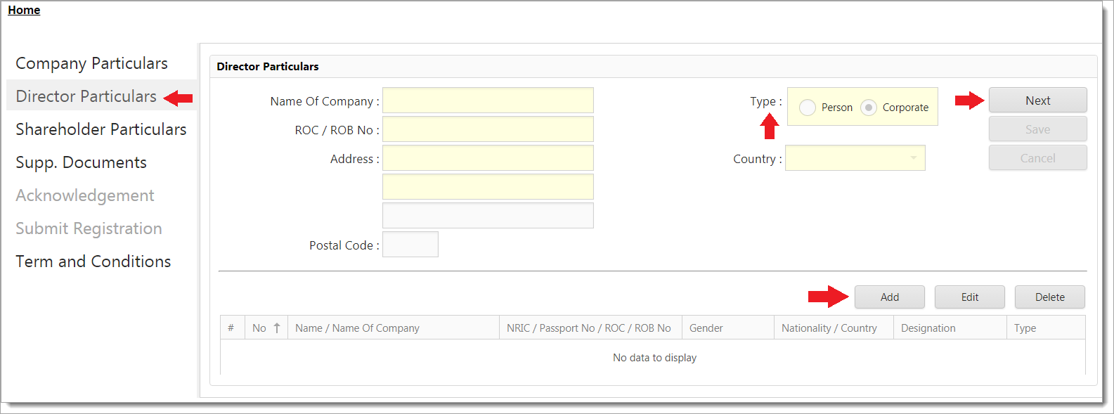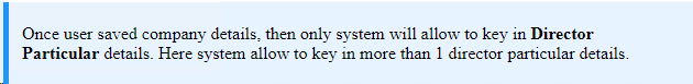 5Select Director Particular’s menu. Type field is set as Corporate as below. You need to fill up all mandatory fields.