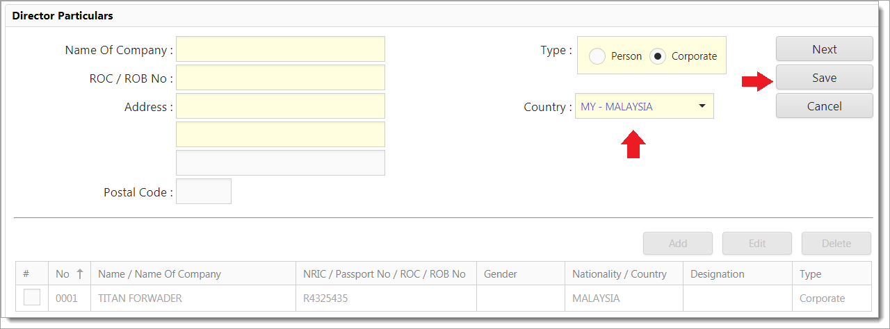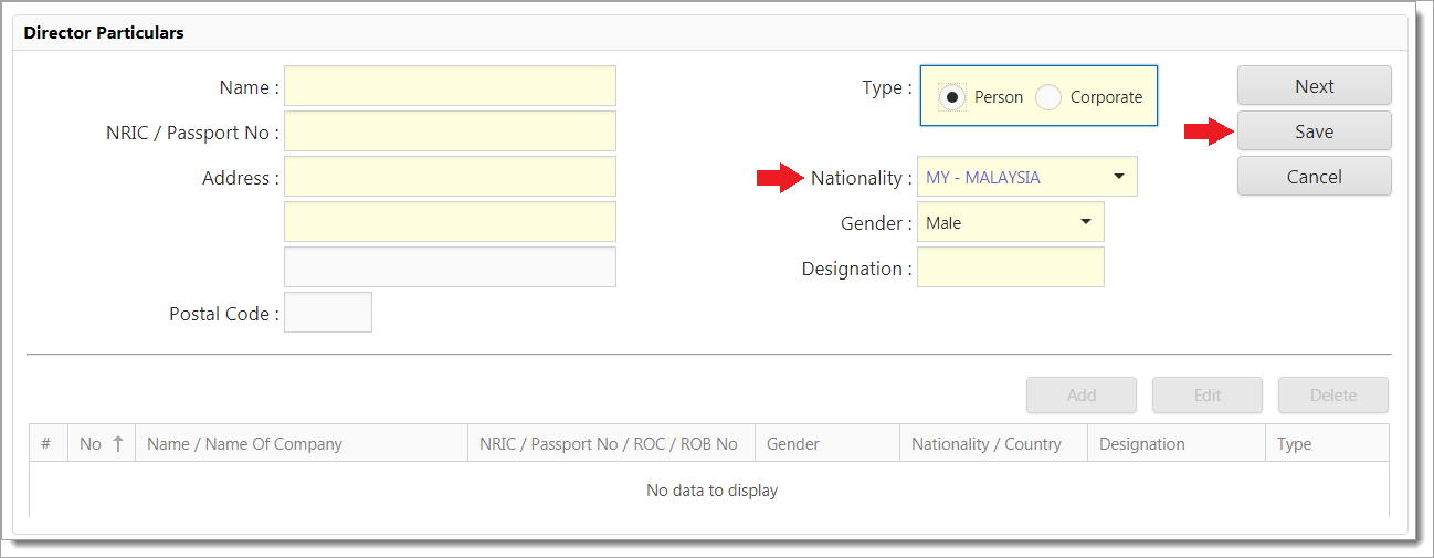 1Entry page for Director Particulars will be shown as below. For the Type field, choose Person radio button as below. You need to fill up all the mandatory fields.