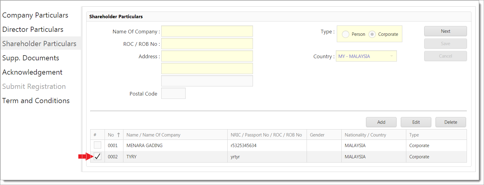 1Go to Shareholder Particulars Entry and listing page will display if any existing records.