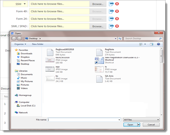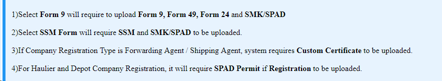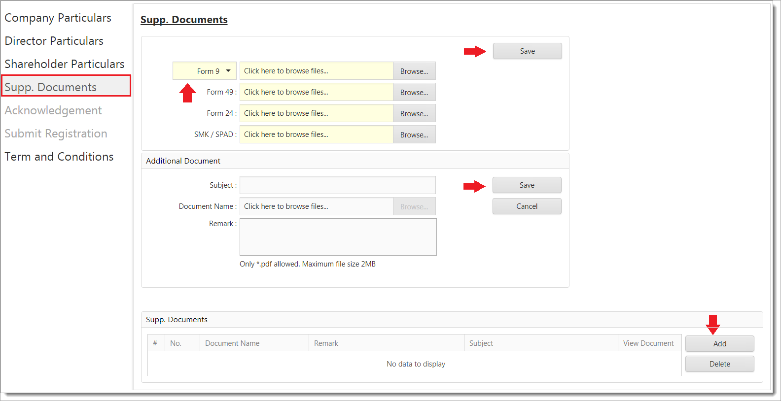 1.If you select Form 9, fields for Form 29, Form 42 and SMK/SPAD will be activated and this requires uploading documents in pdf format.