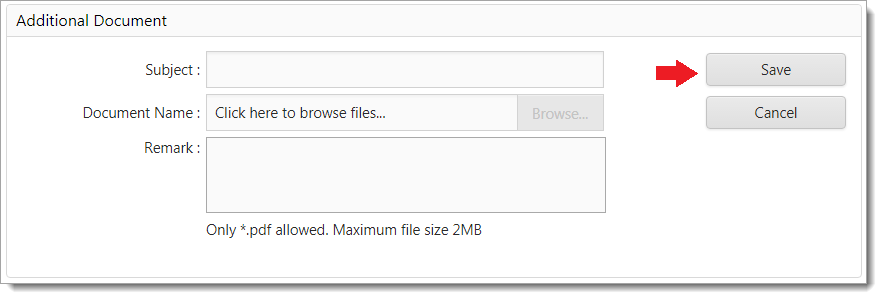 4Enter the Subject, Remark and click on Browse button to select any document then click on button to save records with message display “Additional Document save successfully!”.