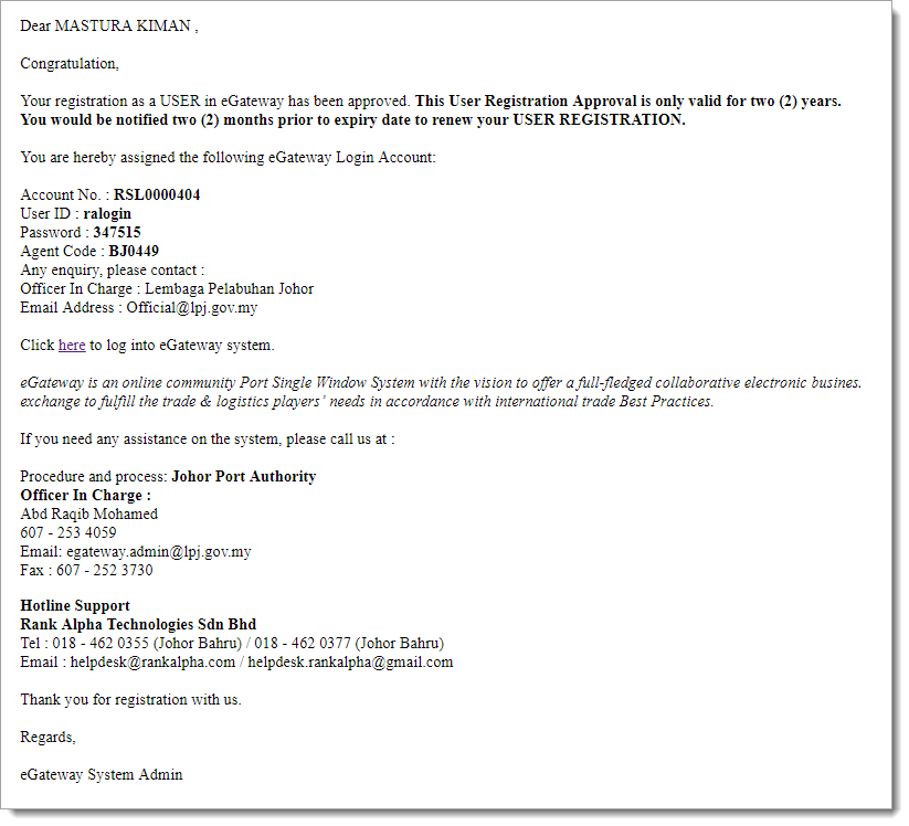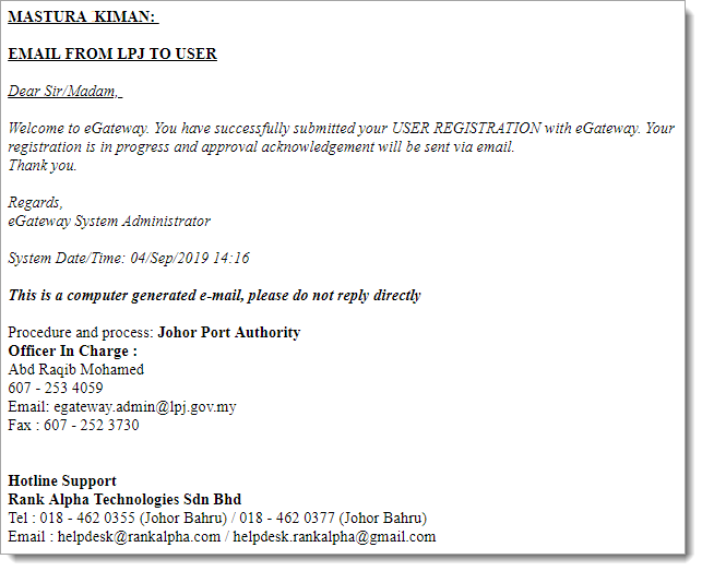 2Approved registration by Johor Port Authority will notify you via your registered email with subject eGateway - New Company Approval.