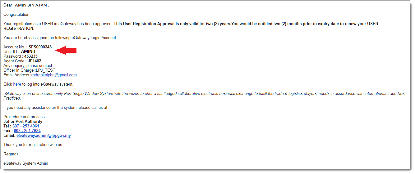 2When you registration is approved by Johor Port Authority, you will get an email with your Administrator Login ID.