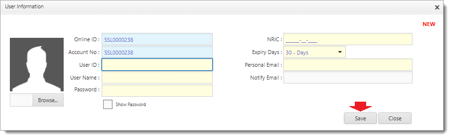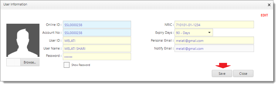 8Click button to confirm save the entries and system will show message “Record Successfully Saved!“ otherwise click on to close the page without saving the record.